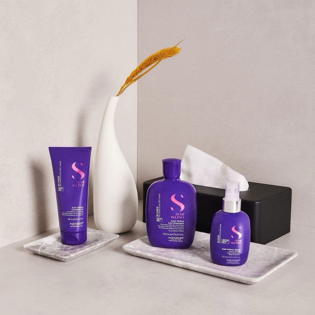 Το σαμπουάν Alfaparf Semi di Lino Anti-Yellow Low Shampoo 250ml καθαρίζει απαλά και εξουδετερώνει τους ανεπιθύμητους κίτρινους τόνους στα ξανθά μαλλιά.